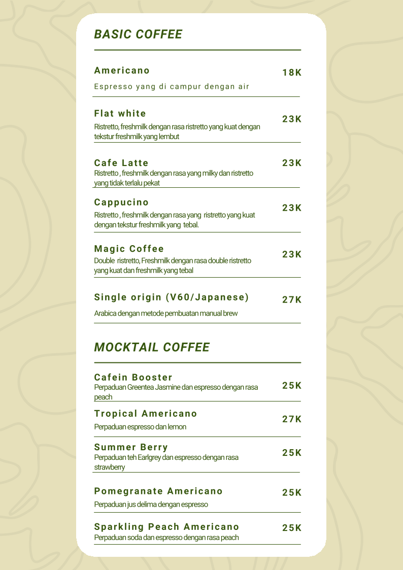Welcome to Booba Cafe, a delightful oasis nestled in Cileunyi, Bandung. This charming cafe offers a versatile menu, catering to both coffee enthusiasts and snack lovers alike. Start your day with their basic coffee selections, including the robust Americano and creamy Cappuccino, each priced affordably.